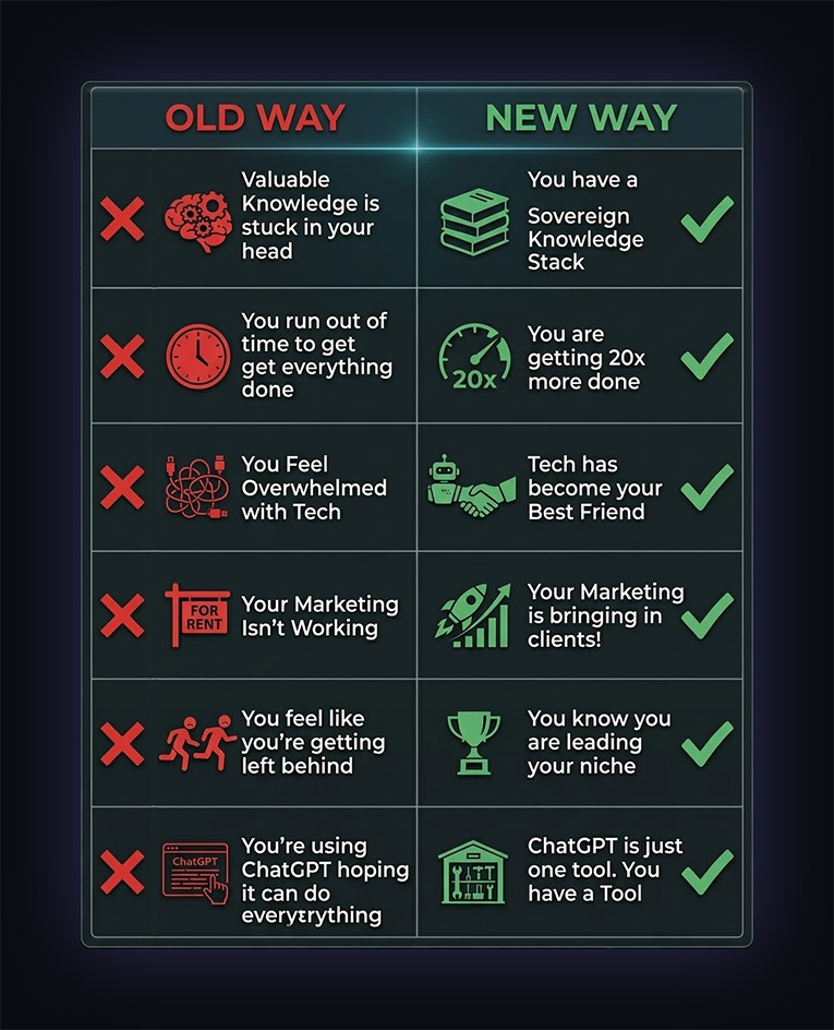 The five systems that transform scattered knowledge, inconsistent marketing, and manual client support into a structured, scalable business powered by AI.